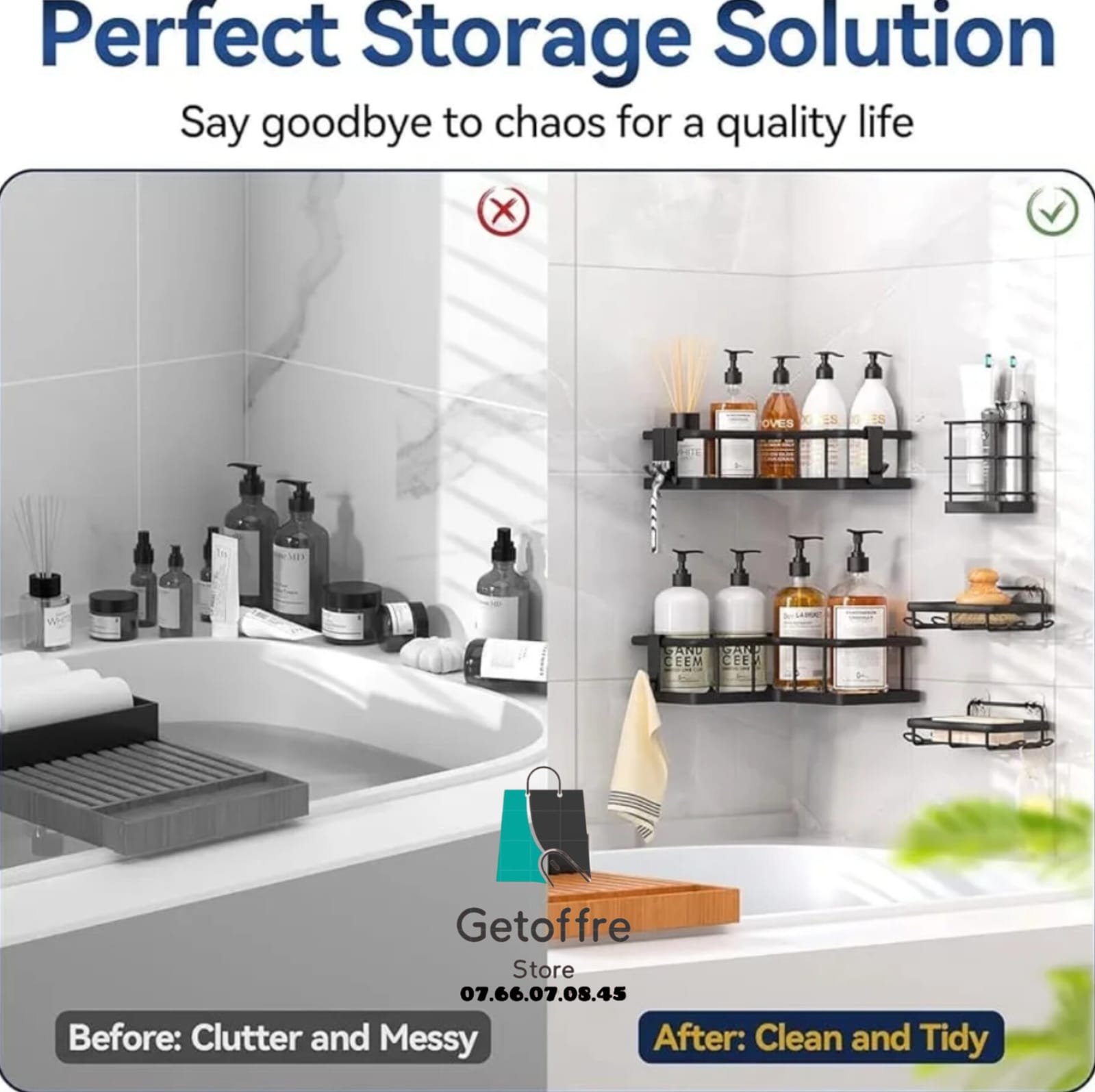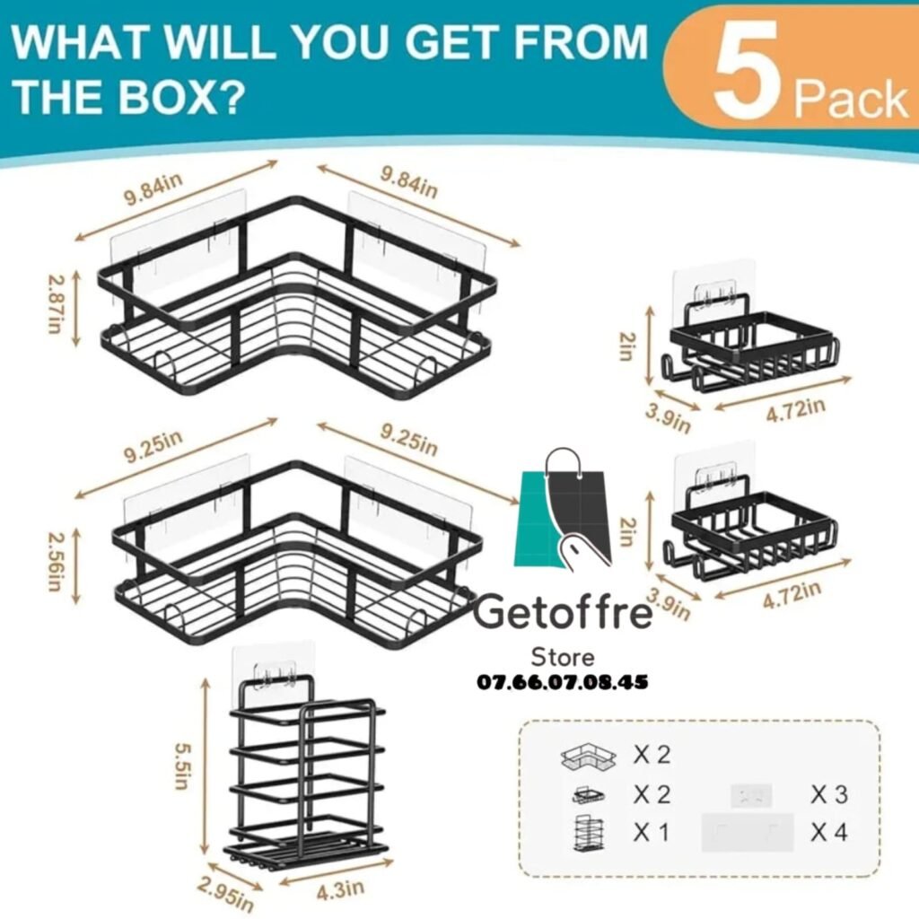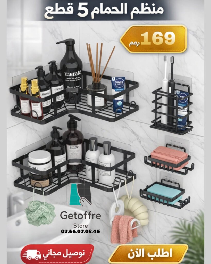 - 5 قطع متنوعة: تناسب جميع احتياجات التخزين في الحمام من رفوف، حوامل، وصواني.